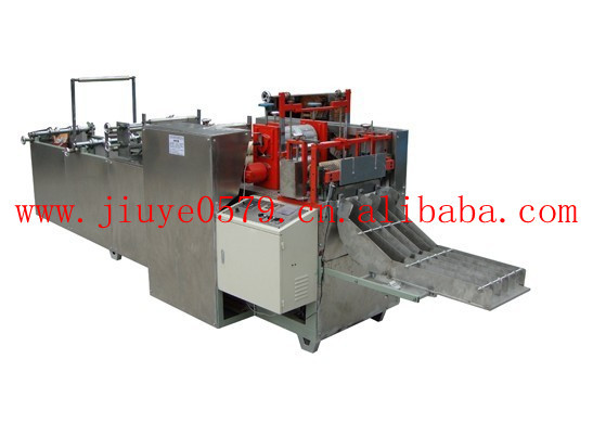 1. 設(shè)備的工作原理: 二卷原料組合折疊→加溫壓痕→裁斷→自動計數(shù)→成品輸出,全自動完成。